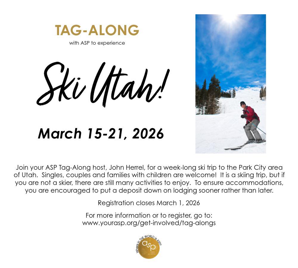 Join your fellow ASP members for a week of skiing, camaraderie, and mountain views in the stunning Park City area of Utah. This trip is open to ASP members, non-members, singles, couples, and families with children. Whether you're a seasoned skier or simply there for the beauty and connection, you're welcome to join for all or part of the trip.