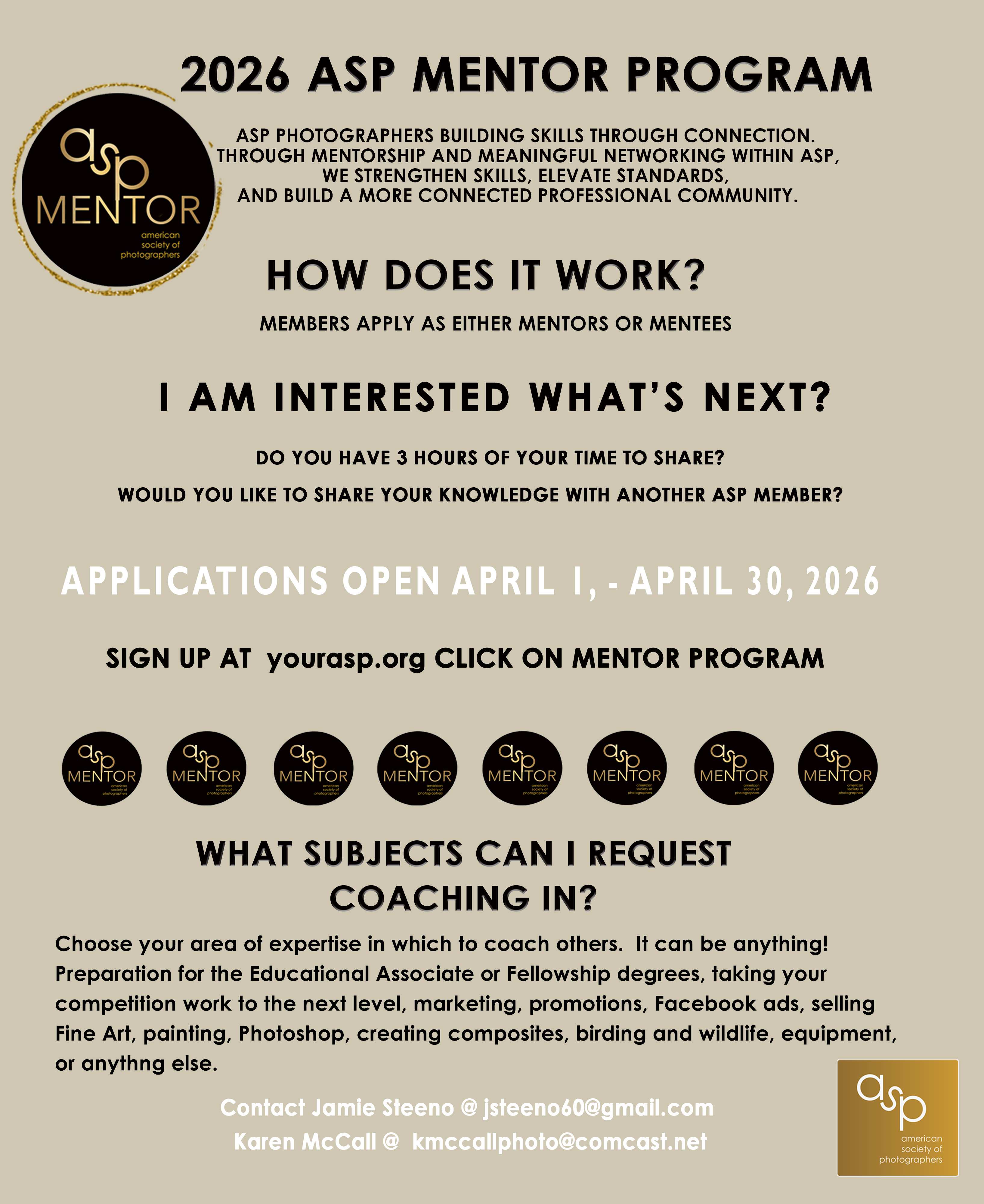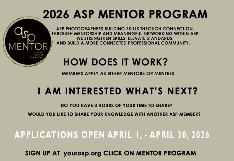 The ASP Mentors Program, established in 2020, brings together photographers within the American Society of Photographers who are eager to learn, grow, and support one another through meaningful connection and shared experience.