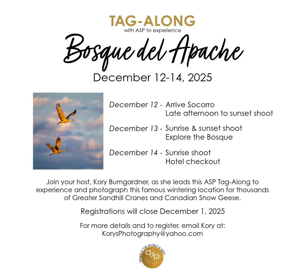 This experience is perfect for wildlife and nature photographers at all levels. Bring your longest lenses, warm layers, and creative spirit. This is a self-paced, flexible opportunity to photograph breathtaking scenes and connect with fellow ASP creatives.